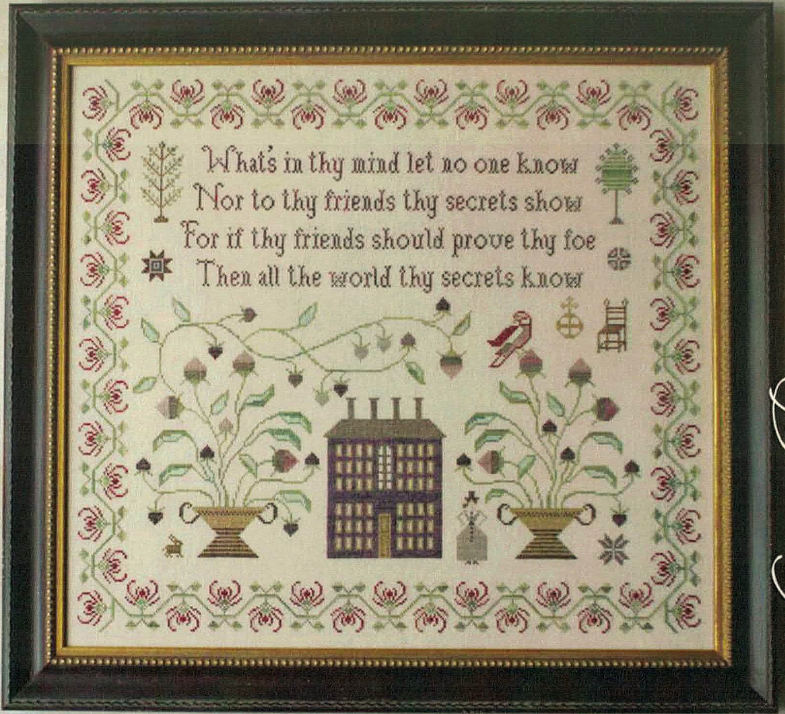 This elegant sampler combines meaningful text about discretion and friendship with beautifully balanced motifs including a stately three-story house, decorative urns overflowing with graceful vines, and charming scattered elements. The delicate rose border frames the entire piece, creating a sophisticated design that celebrates both traditional stitching techniques and timeless wisdom about the value of keeping confidences.