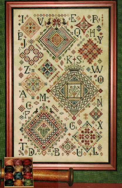 The vibrant colors of the Valdani threads, the luscious color of the Picture This Plus fabric, and various research on Quaker motifs were the inspiration for this design. In fact, Quaker motifs have inspired stitchers for over 100 years. This piece honors the sampler stitchers of the past, while embracing the rich colors and textures of today.