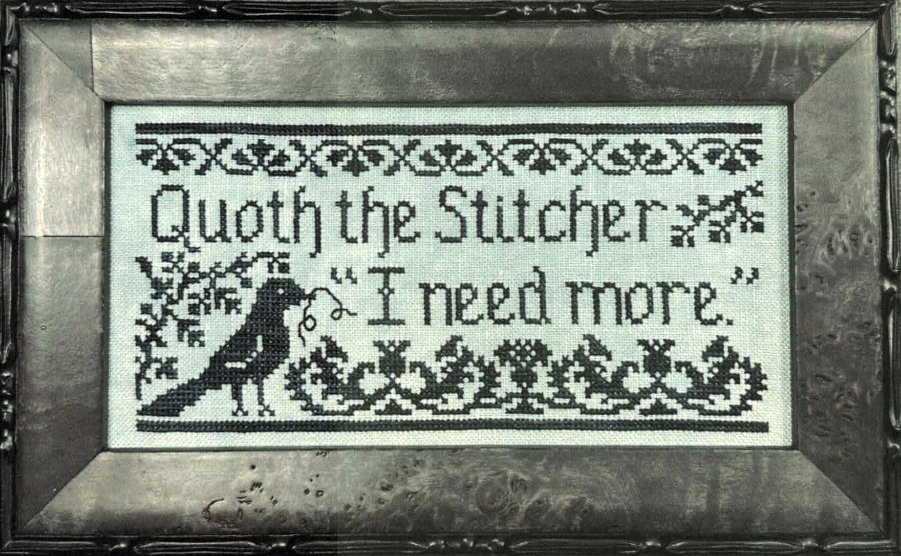 This charming design captures the eternal struggle of every stitcher with its clever wordplay on Poe’s “The Raven.” The classic sampler styling features beautiful traditional borders with geometric patterns and flowing floral vines, while the central raven motif adds dramatic visual interest to this tongue-in-cheek tribute to our shared stitching obsession.