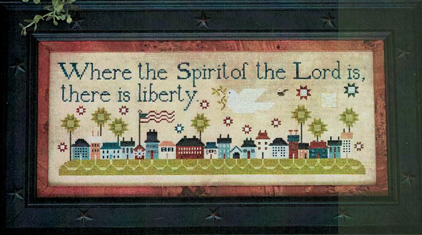 This inspiring sampler features the uplifting biblical verse “Where the Spirit of the Lord is, there is liberty” above a charming village scene complete with colonial-style houses, trees, and patriotic elements including an American flag. The design combines faith-based messaging with Americana imagery, making it perfect for those who appreciate both spiritual and patriotic themes in their stitching.
