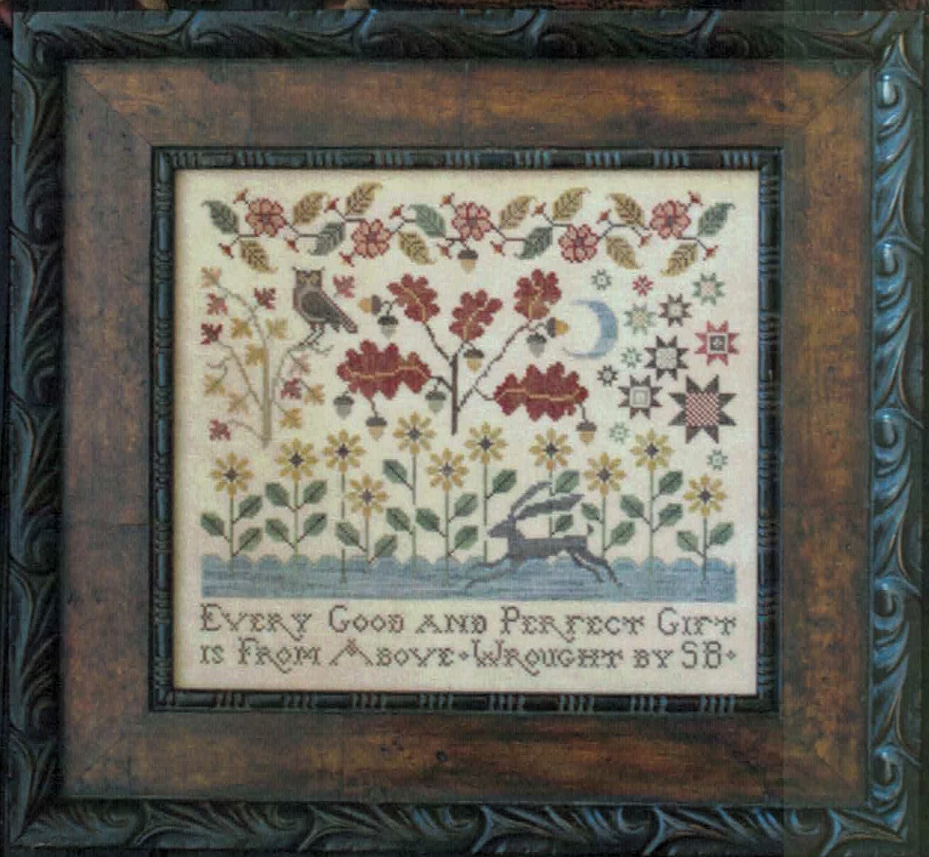 This beautiful autumn sampler features a charming folk art scene with a running rabbit beneath blooming flowers, oak trees, and decorative motifs. The traditional verse ‘Every Good And Perfect Gift Is From Above’ adds meaningful sentiment to this seasonal design.