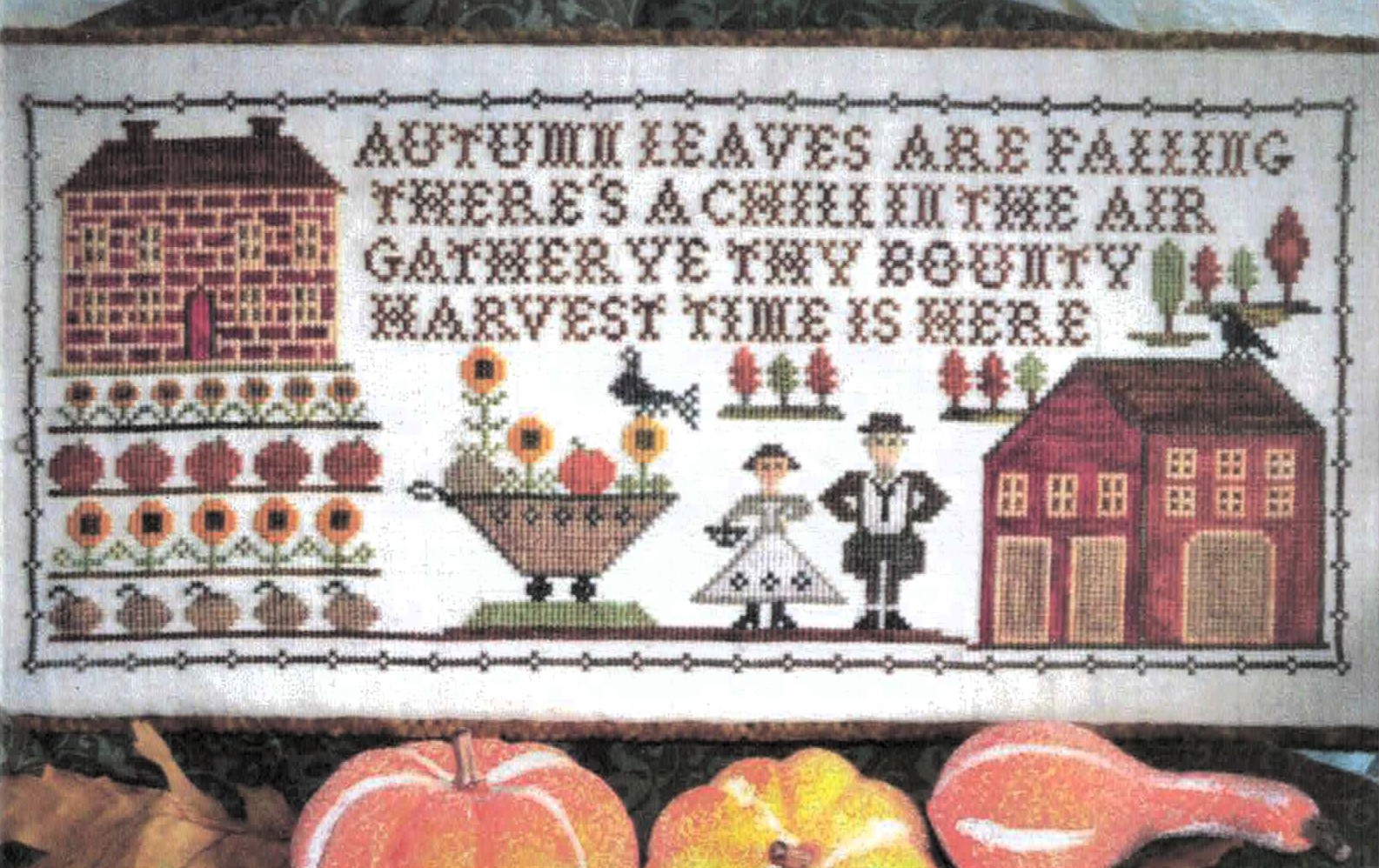 Autumn leaves are falling, There’s a chill in the air. Gather Ye Thy Bounty, Harvest time is here.  This fall sampler is resplendent in rich, warm rustic hues.