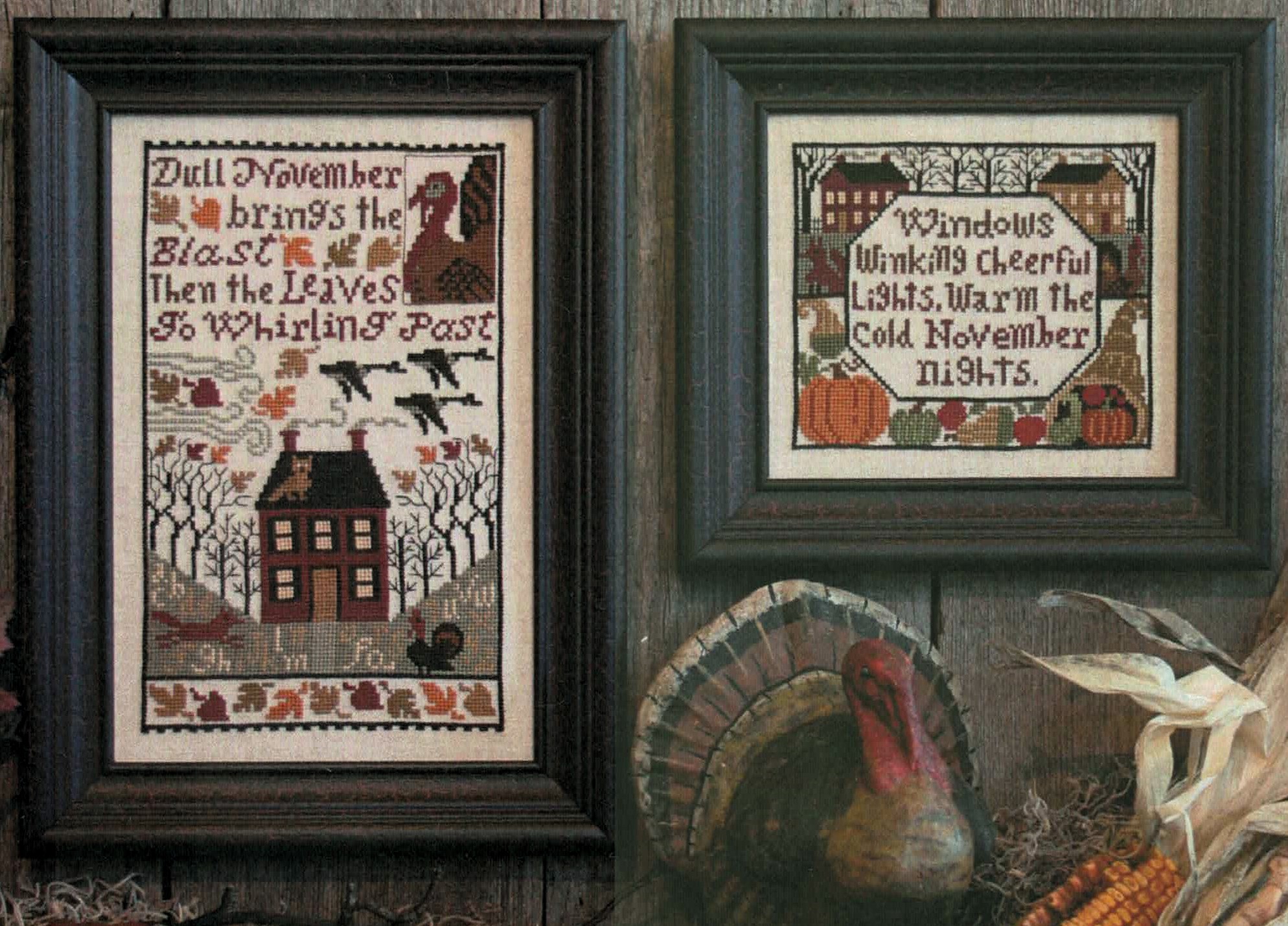 This traditional sampler captures November’s transition from autumn’s vibrant colors to winter’s approach, featuring lyrical text about November’s blast bringing whirling leaves. The companion piece shows windows with cheerful lights warming cold November nights, surrounded by pumpkins and harvest motifs that evoke the cozy spirit of Thanksgiving season.