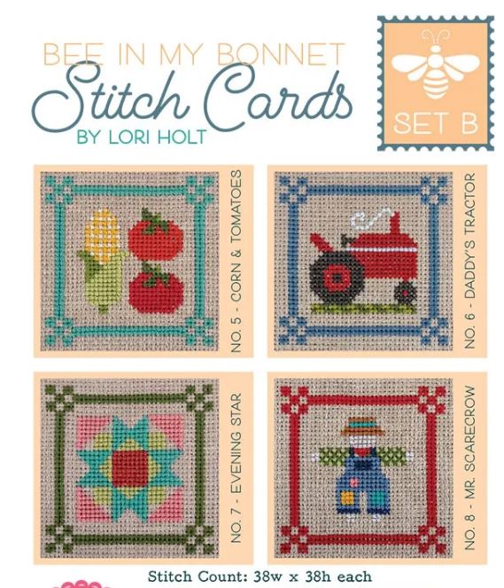 The Bee in My Bonnet Stitch Cards come with full-color instructions, diagrams and supply list, including suggested DMC colors. Each set includes four stitch cards printed on durable cardstock and comes in a plastic bag.
