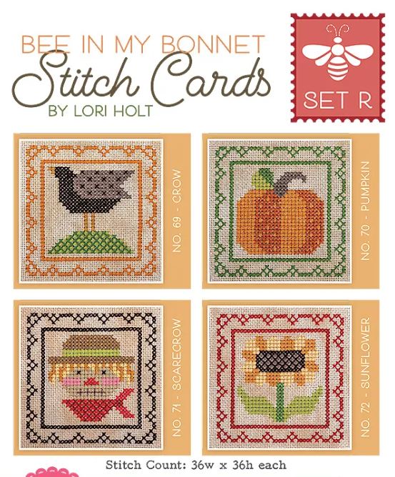 The Bee in My Bonnet Stitch Cards come with full-color instructions, diagrams and supply list, including suggested DMC colors. Each set includes four stitch cards printed on durable cardstock and comes in a plastic bag.