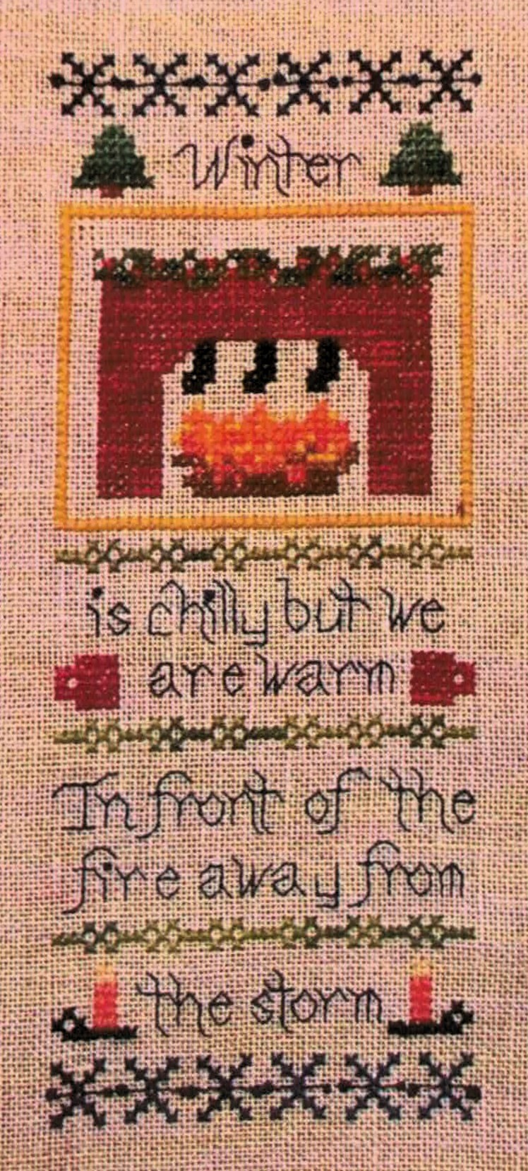 This delightful sampler captures the essence of winter’s comfort with its central fireplace scene complete with flickering flames and decorative garland. The design beautifully combines traditional sampler elements including ornate snowflake borders, charming evergreen trees, and candlestick motifs, all arranged around an inspiring verse about finding warmth during the cold winter months.