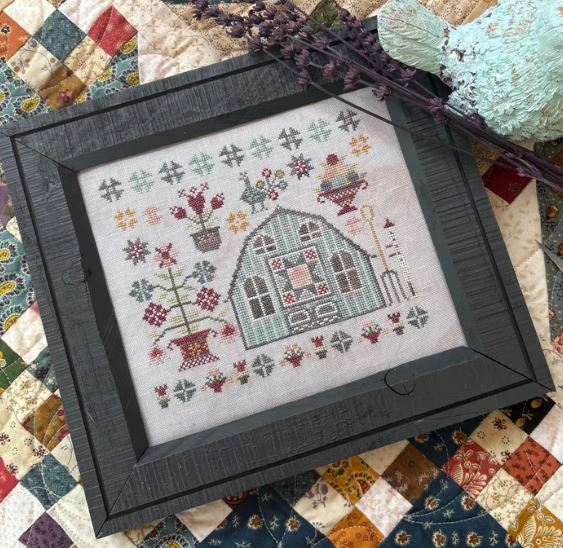 The pattern showcases a traditional barn structure with detailed architectural elements including windows and a distinctive curved roof. Delicate flowering vines and geometric motifs frame the barn, creating a balanced composition that celebrates rural American heritage and the beauty of summer gardens in full bloom.