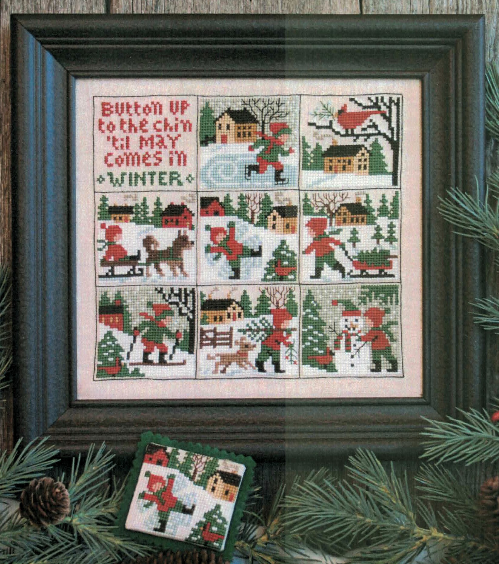 The design captures the nostalgic charm of old-fashioned winters with its folk art styling and whimsical seasonal wisdom. Each of the nine blocks tells its own winter story, from Santa preparing his sleigh to cheerful snowmen standing guard over snowy villages, creating a cohesive celebration of winter’s magic that will bring warmth to any home.