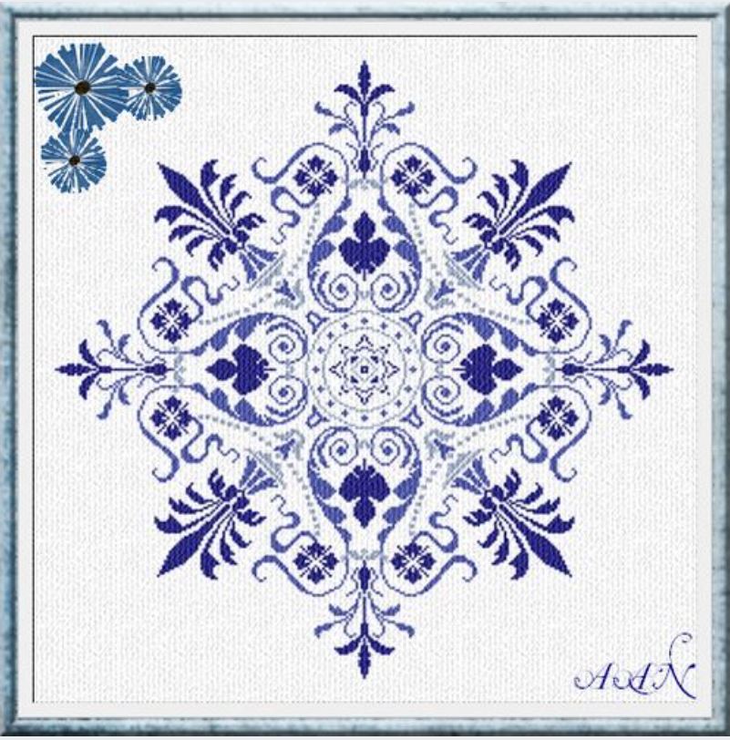 “Here you Are” – a lovely snowflake-like artistic interpretation of a compass face is presented in lovely indigo blues.
