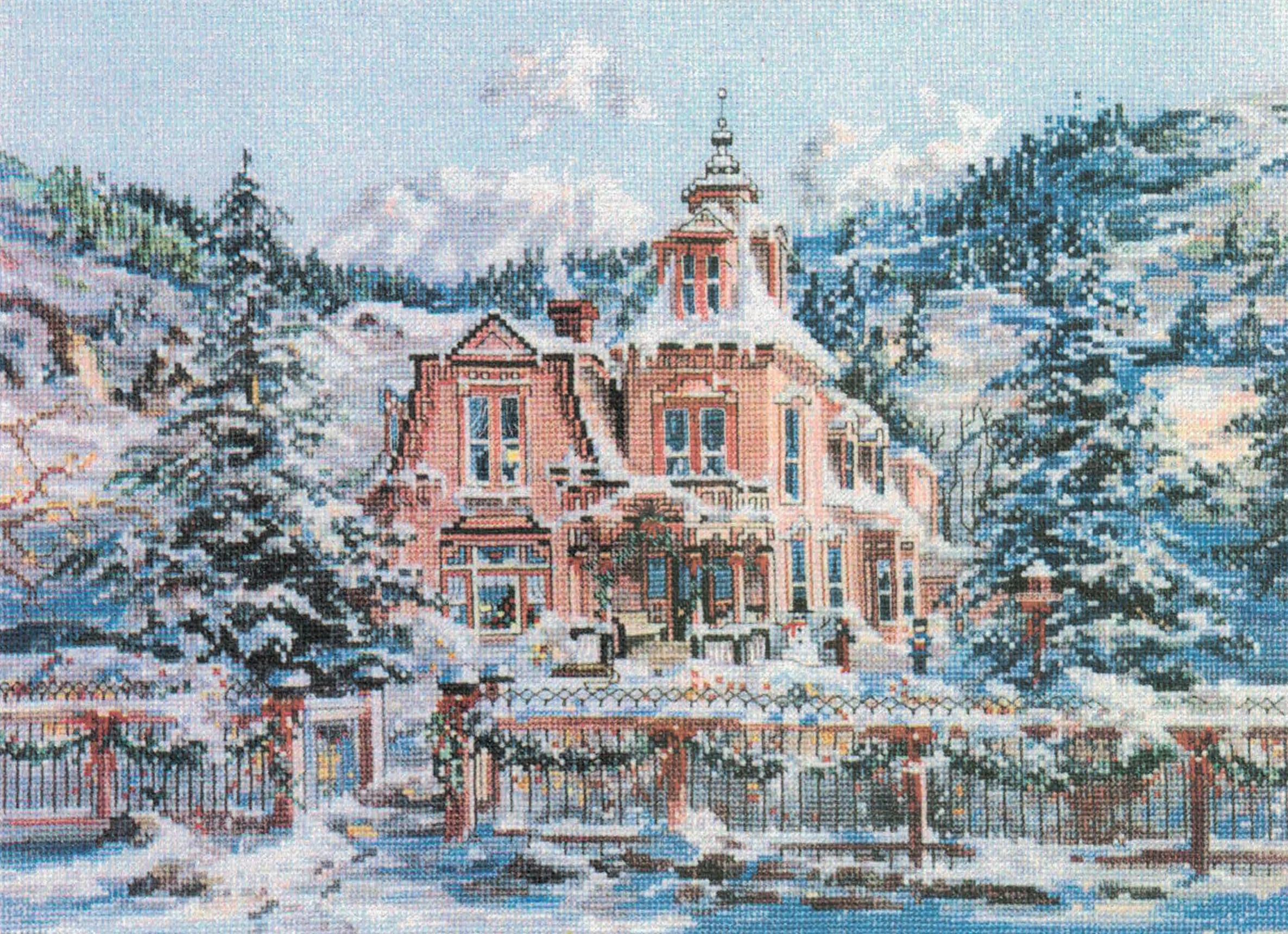 This stunning design showcases a grand Victorian-era brick mansion nestled among snow-covered mountains and towering evergreen trees. The detailed architectural elements include multiple stories, ornate windows, a distinctive bell tower, and decorative trim work, all rendered in rich warm tones that contrast beautifully against the cool winter palette of blues and whites that dominate the snowy landscape.