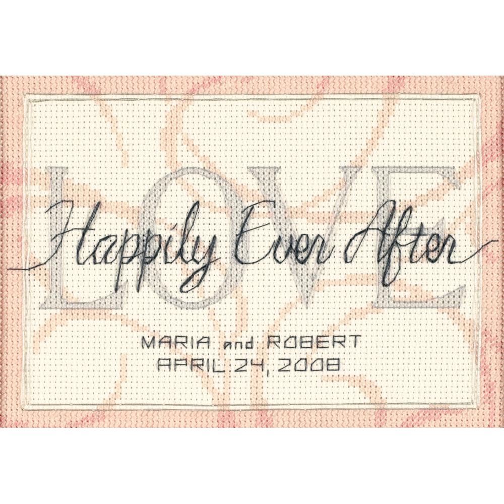 Wish the happy couple well with this lovely wedding sampler! The fairytale phrase “Happily Ever After” is written against a backdrop of Love and pale pink. Metallic threads add a sparkly finishing touch. Personalize it with the names and date of the wedding, using the included alphabet. The petite size of this design makes it a quick and easy stitch.