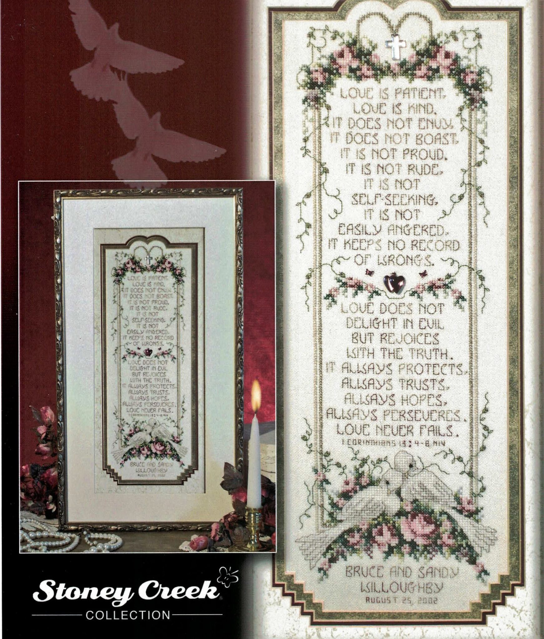 Stoney Creek’s exquisite Love is Patient design features doves, flowers and the words to the Bible verses found in 1 Corinthians 13.  It is a glorious way to celebrate the joining of two hearts since it can be personalized with the names of the bride and groom and their wedding date