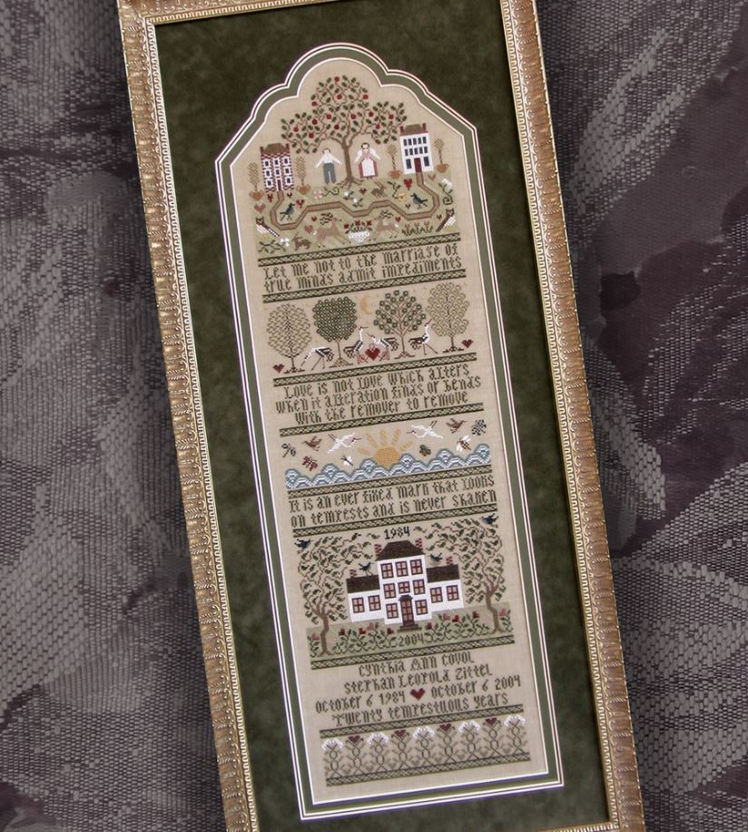 Shakespeare’s timeless verse is set among motifs of domestic happiness and adventures together in this stunning marriage (or anniversary) sampler.